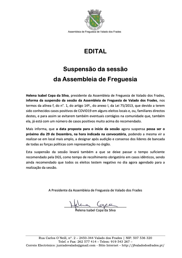 Suspensão da sessão da Assembleia de FreguesiaPor JF Valado dos Frades em Dezembro 22, 2021Dezembro 22, 2021 2021-12-22_AssembleiaFVF_Suspensão-da-Sessão-AFVFDescarregar Categorias: Editais