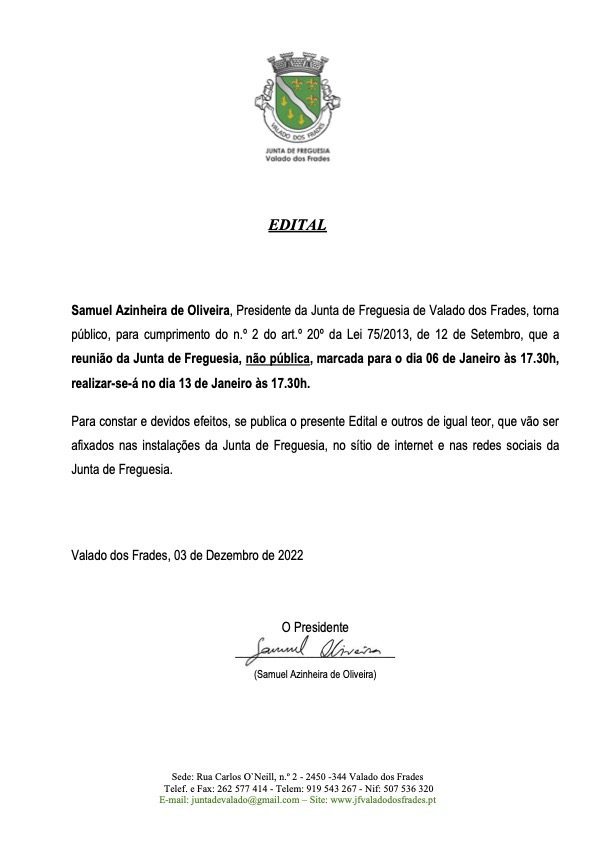 Reunião da Junta de Freguesia – públicaPor JF Valado dos Frades em Janeiro 3, 2022Janeiro 3, 2022 Edital-alteração-reunião-executivoDescarregar Categorias: Editais