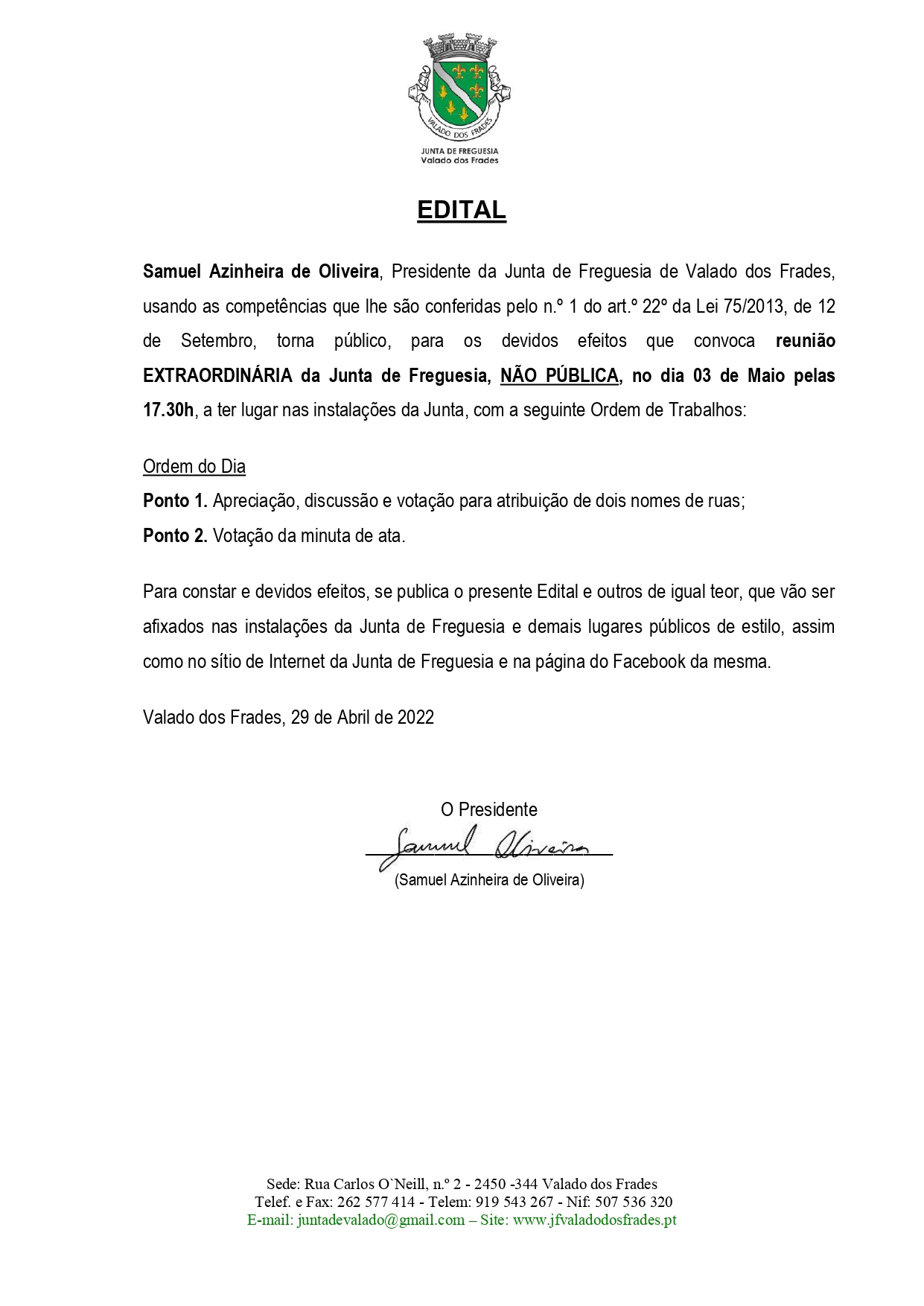 Reunião da Junta de Freguesia – públicaPor JF Valado dos Frades em Abril 29, 2022Abril 29, 2022 Edital-16-03-05-2022Descarregar Categorias: Editais