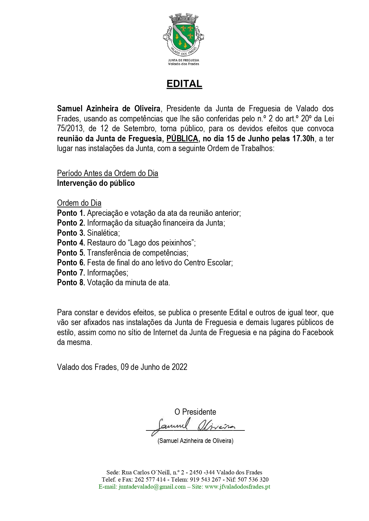 Reunião da Junta de Freguesia – públicaPor JF Valado dos Frades em Junho 9, 2022Junho 9, 2022 Edital-20-15-06-2022-1Descarregar Categorias: Editais