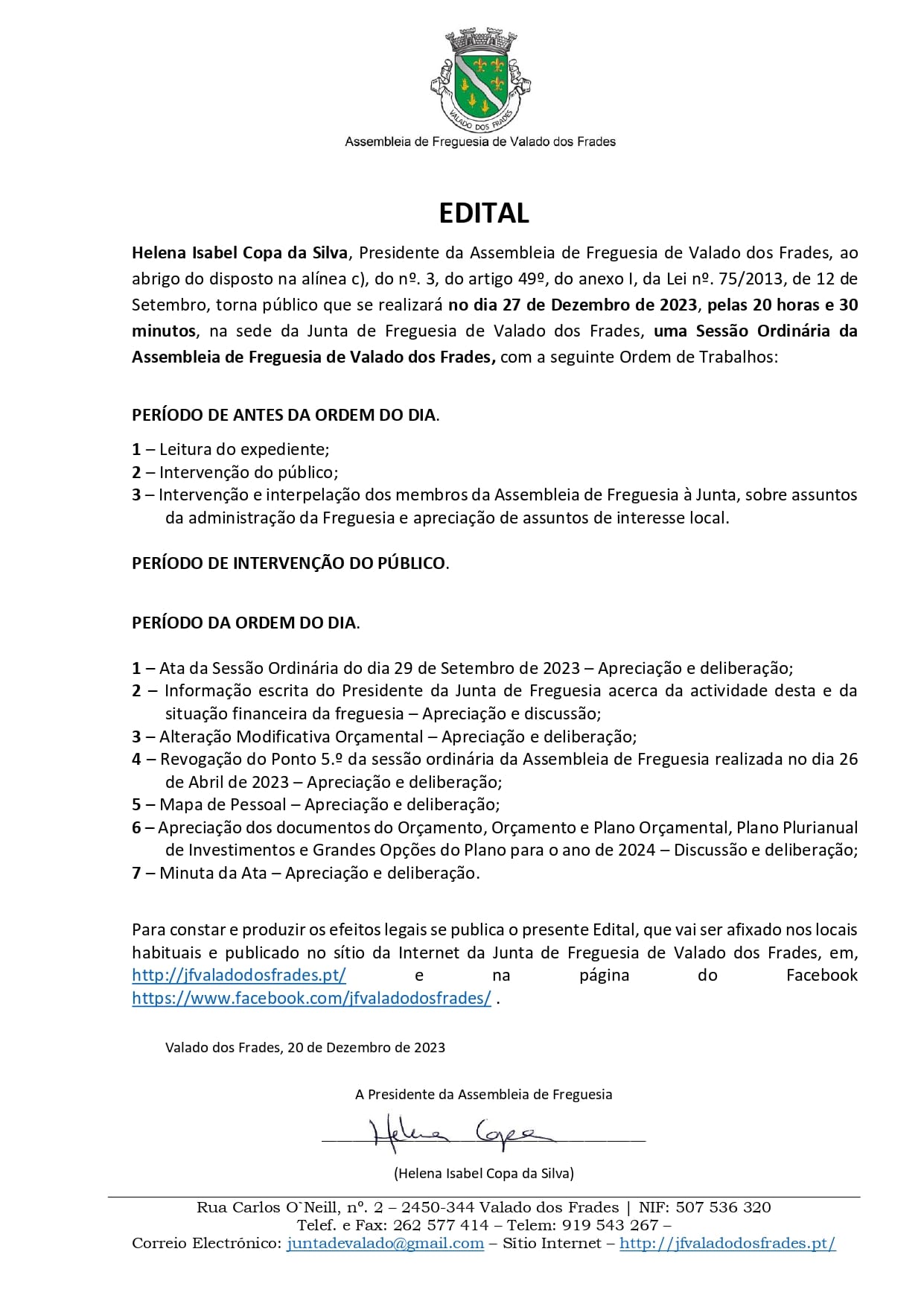 Assembleia de Freguesia 29 de Abril, às 20h30, na sede da Junta de Freguesia de Valado dos Frades